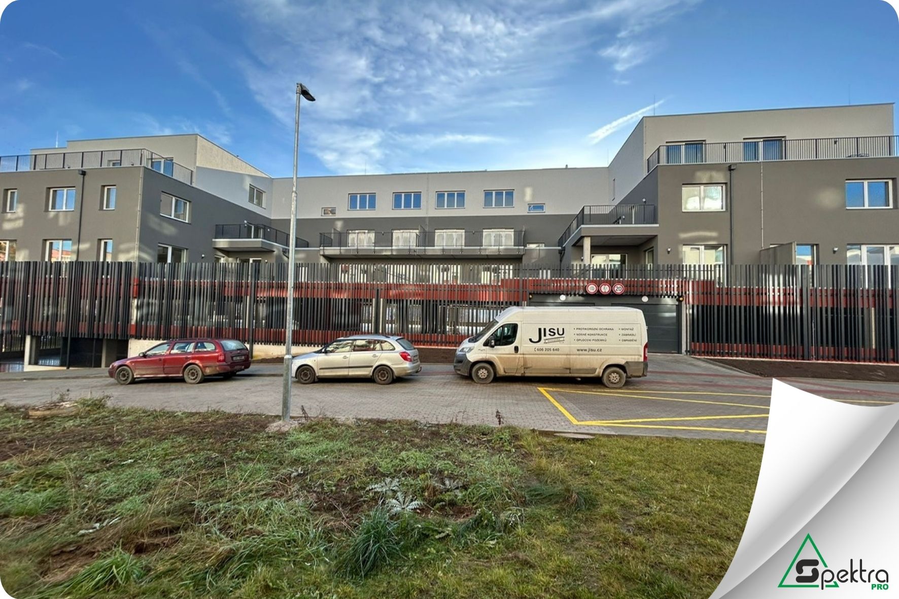 Začali jsme provádět práce vně objektu. Je zrealizována komunikace se sjezdy do garáží do 1.NP a 2.NP, popelnicová stání. Dle klimatickcých podmínek započaly práce na zateplení objektu, probíhají montáže zámečnických prvků jako jsou výplně garážových otvorů, dělící stěny, sloupky zábradlí a konzoly pro zavěšenou fasádu.