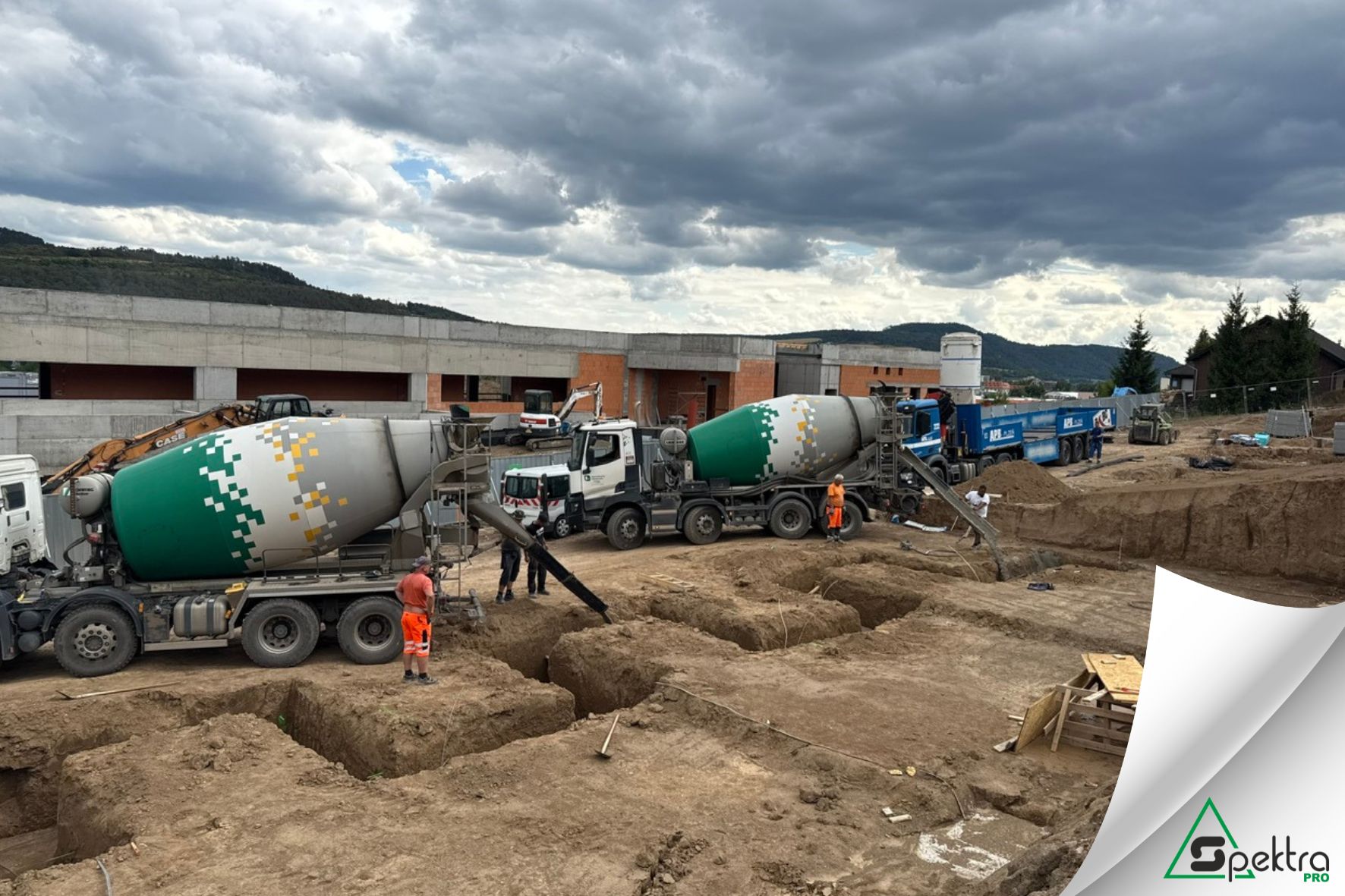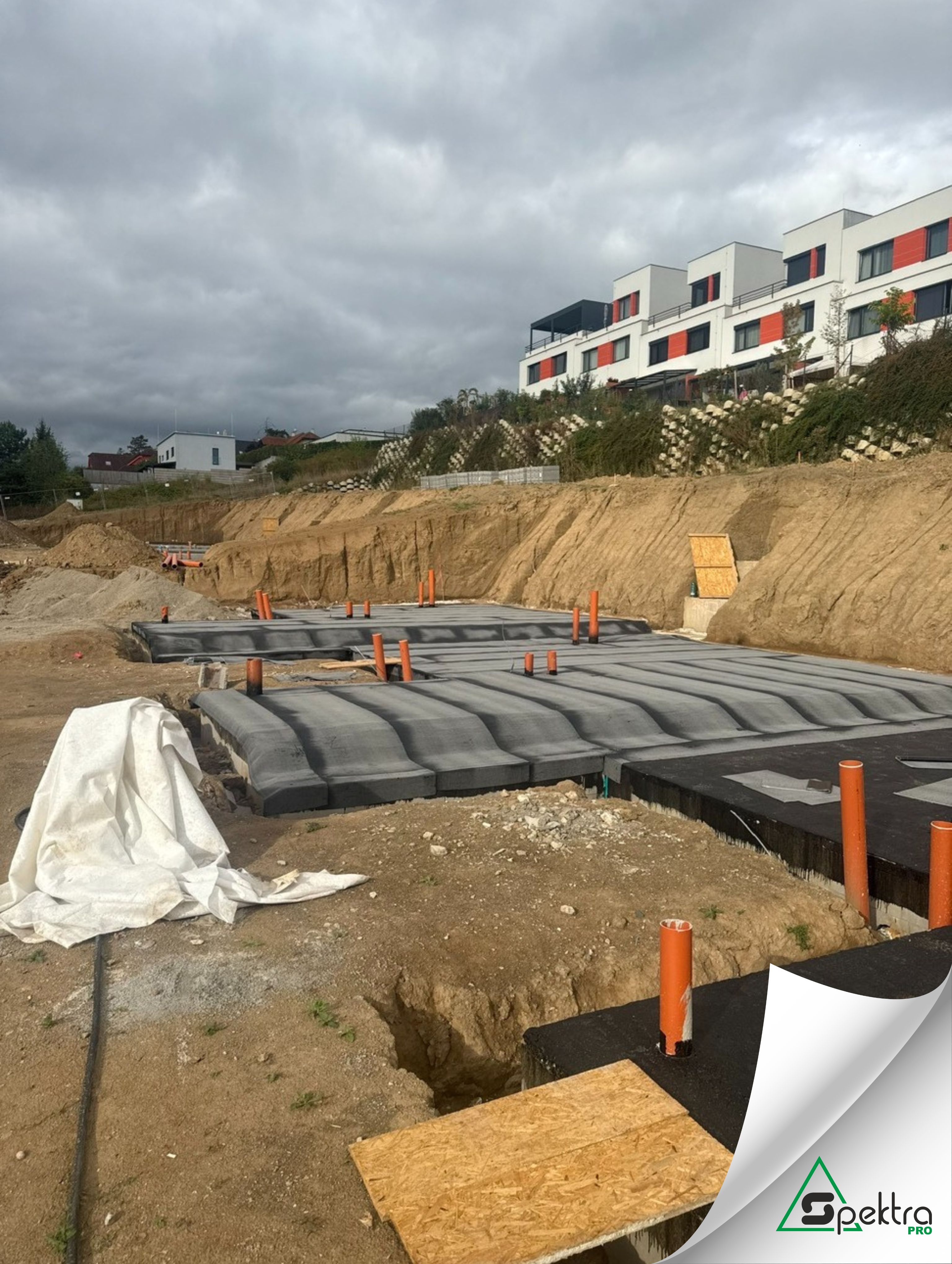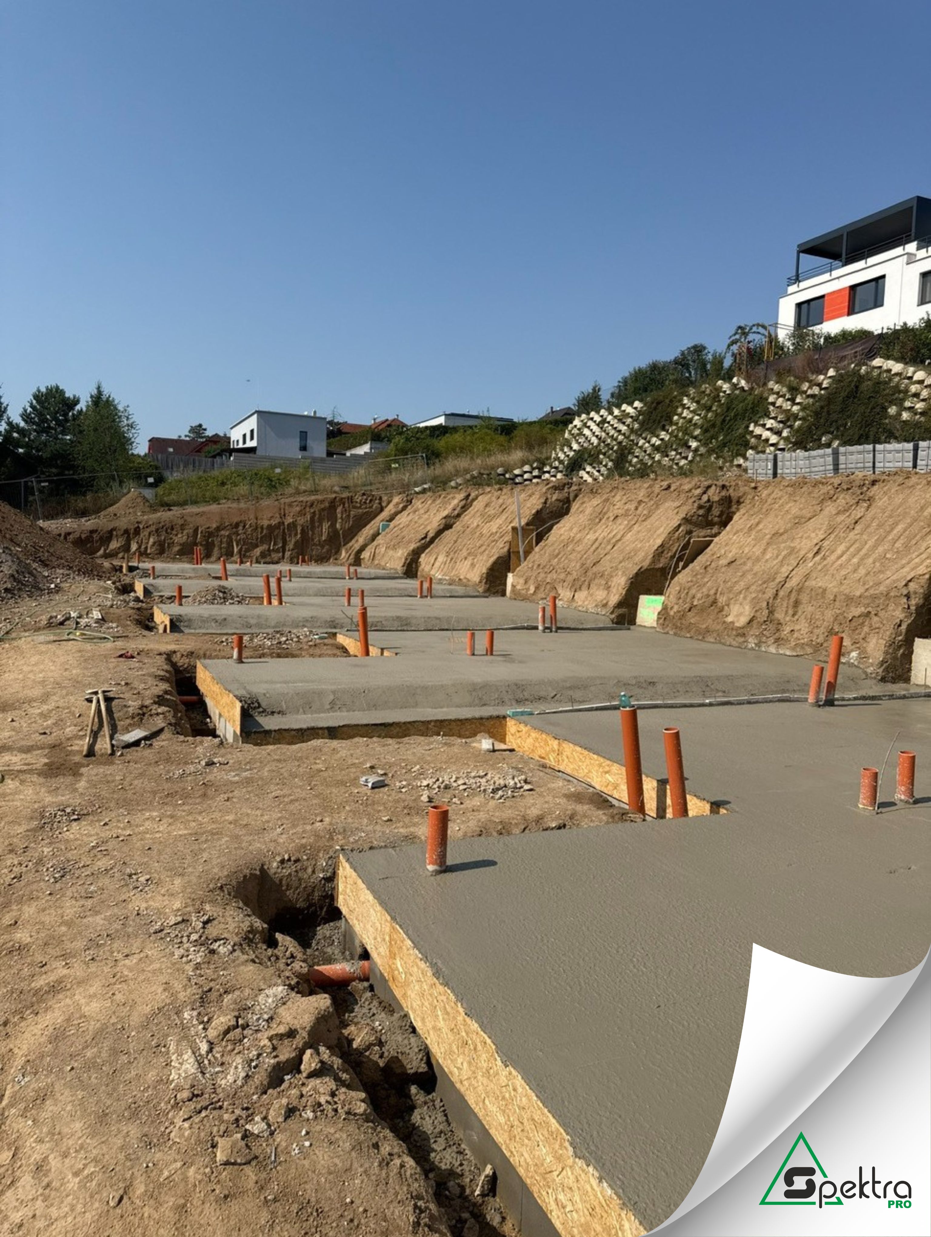 V tomto měsíci jsme dokončili zemní práce, betonáže základových pasů, ležatou kanalizaci a podkladní betony.