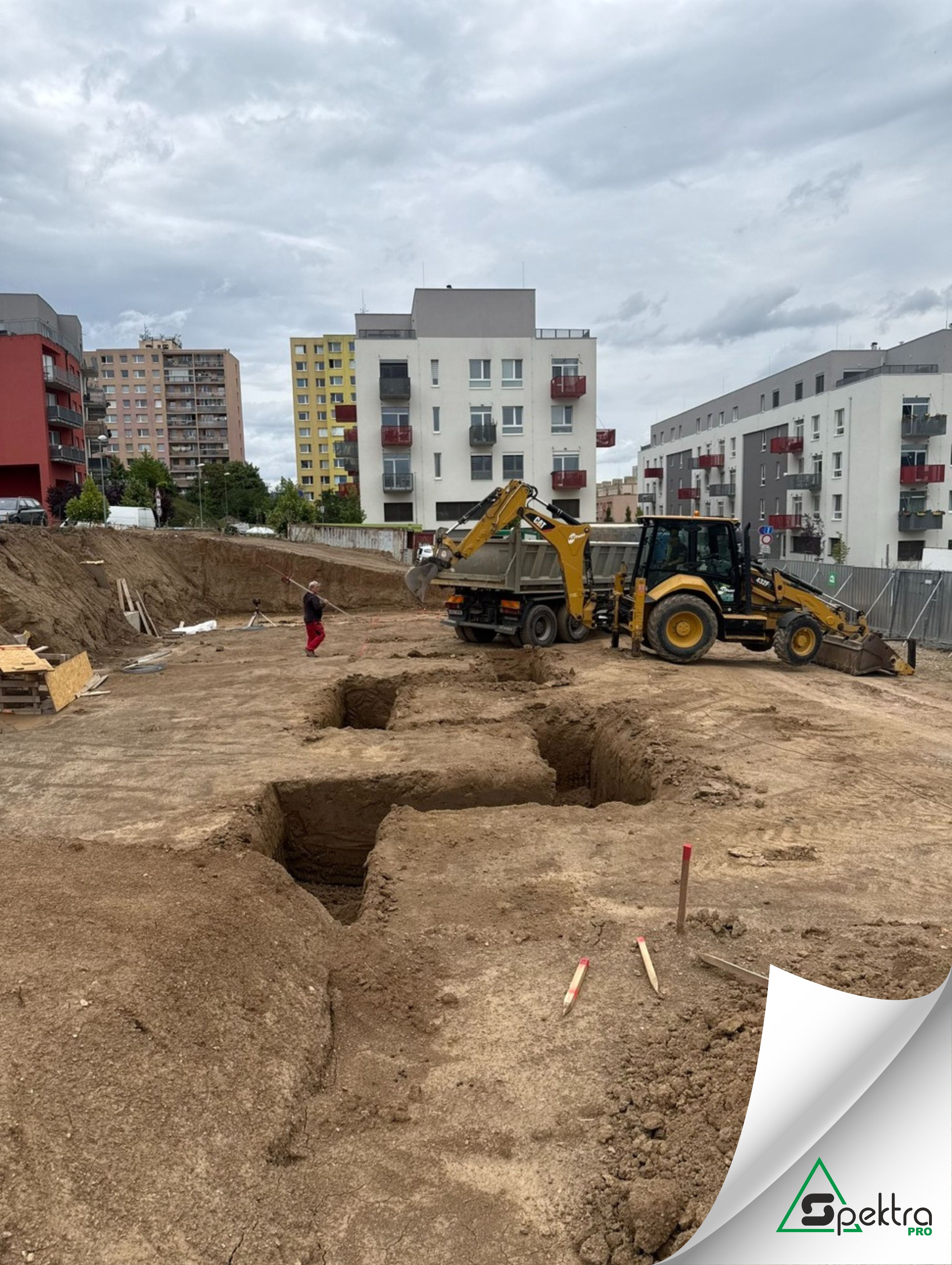 V tomto měsíci jsme začali realizovat hrubé teréní úpravy a výkopy rýh pro základové pasy.