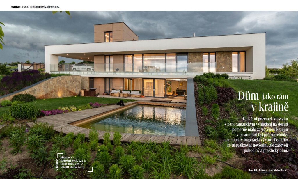 Novostavba rodinného domu je příkladem zajímavého architektonického návrhu, citlivého zasazení do okolní krajiny, skvělé spolupráce mezi architekty, realizační společností i samotným investorem a zároveň precizního provedení. Stavba byla přihlášena do soutěže Stavba roku Středočeského kraje 2020 a získala Cenu za architektonické řešení individuálního bydlení.