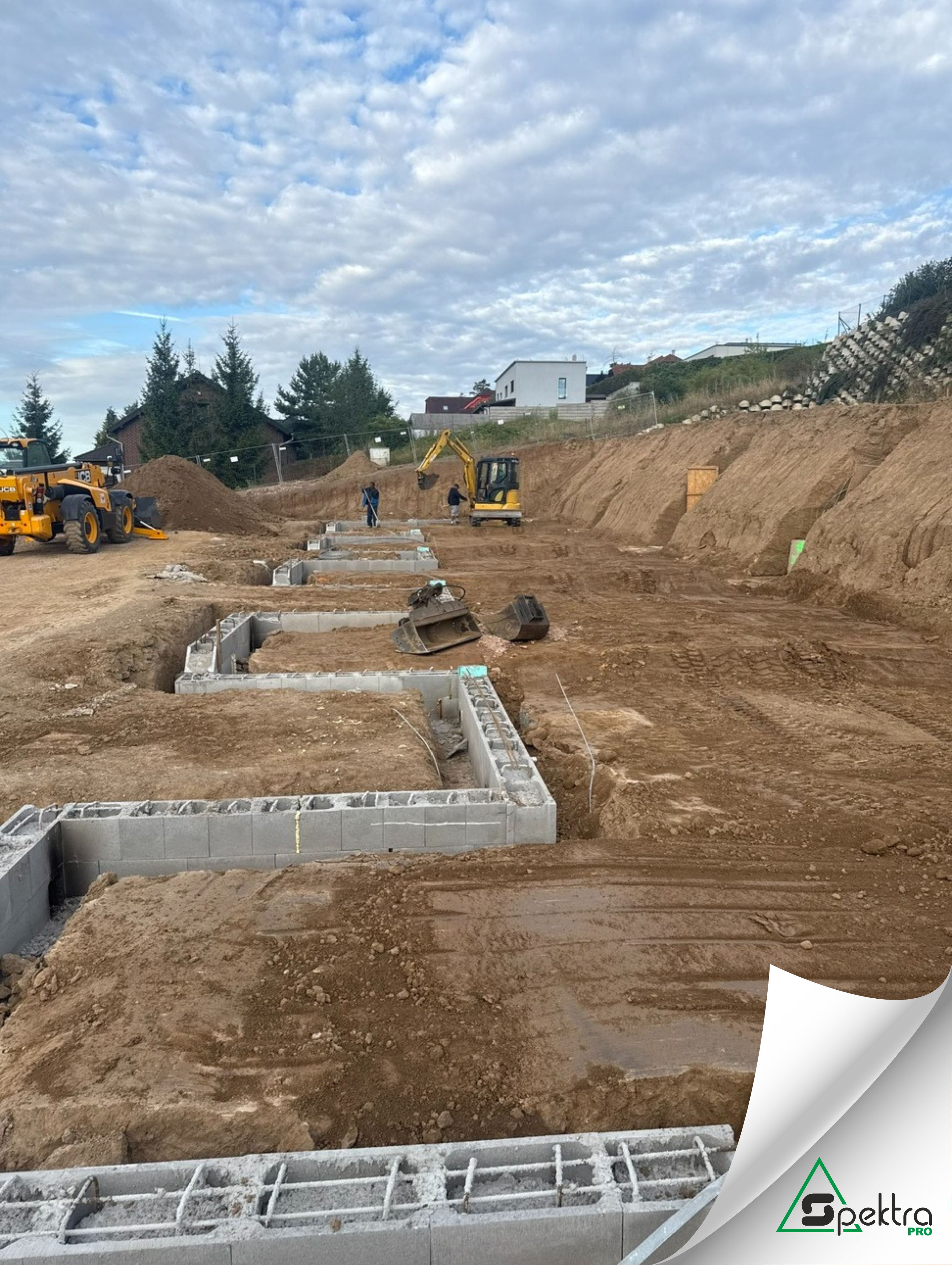 V tomto měsíci jsme začali realizovat hrubé teréní úpravy a výkopy rýh pro základové pasy.